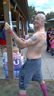 This was taken during my last lap. When I turned the corner, a 50+ mph wind hit me in the face. I wasn't ready for this physically or mentally. I finished the lap then retreated into the restrooms. I watched it hail. I watched tents and canopies get blown away. I was done. The wind had ripped the poncho right off of my arm. That was the only rain gear I owned at the time. (First stop upon getting home was REI. I now own a VERY nice water PROOF [not resistant] jacket).
